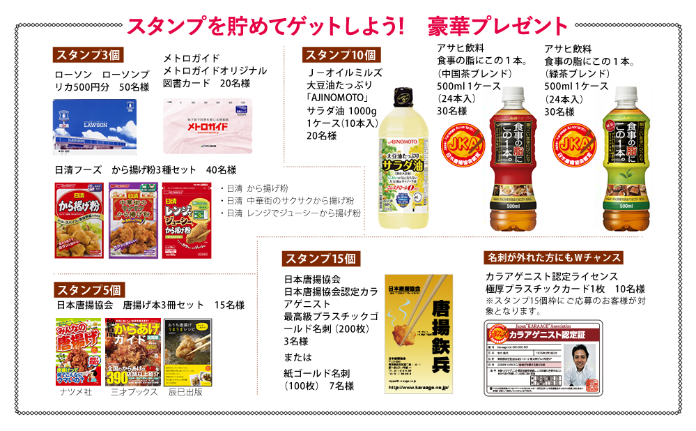 参加店で唐揚げ商品を500円以上お買い上げいただくと、お店に用意してあるチラシの裏面にスタンプを1個押印いたします。スタンプが集まったら、必要事項をご記入の上、お店の応募箱にそのチラシを投函してください。ご希望の賞品を抽選でプレゼントいたします。