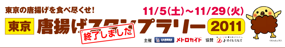 東京の唐揚げを食べ比べて豪華プレゼントをゲットしよう、というイベント「東京唐揚げスタンプラリー2011」が、この11月に開催されます。主催者である日本唐揚協会の八木専務理事が 「東京にはバラエティに富んだ唐揚げ店がたくさんあることをみなさんに知っていただきたくて企画しました」と語る通り、美味しいと評判が高く、個性的な店が多数参加しています。あなたはどれだけ制覇できますか?