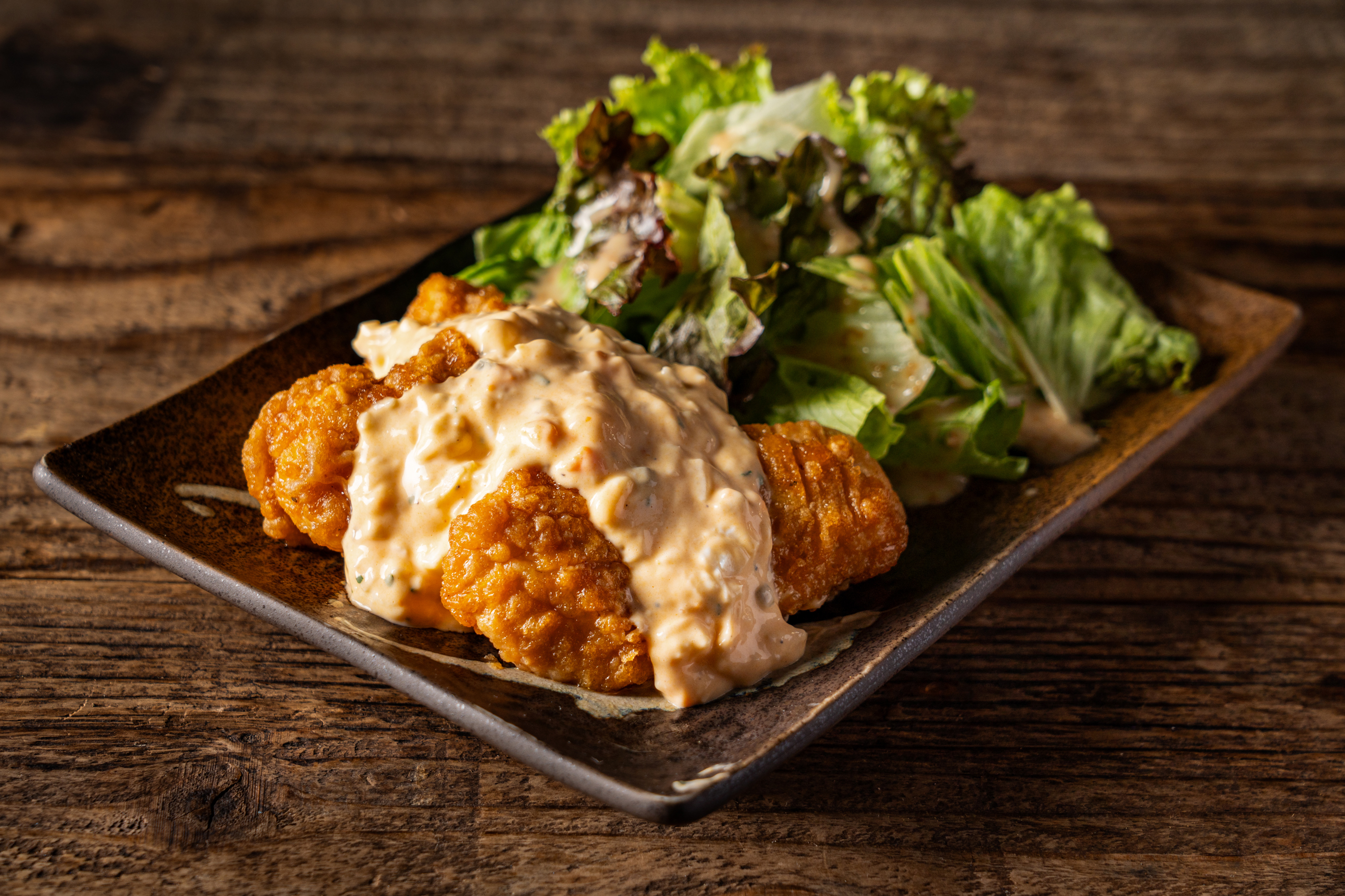 塚田農場の人気メニュー「若鶏のチキン南蛮」は、タルタルソースが大きな特長です。 自社契約農場で育てられたこだわり卵の「塚だま」を使い、店舗で卵を茹で、マヨネーズ、たまねぎ、ピクルス、調味料で丁寧に作るオリジナルのタルタルそーすです。 「塚だま」の濃厚な味わいと具だくさんで食べごたえのあるタルタルはコクのある卵の良い香りが漂い食欲をそそります。 チキンは本場宮崎のソウルフードとしての基本に忠実に、粉をまとわせたのち、全卵を使った卵液に潜らせた後、カラッと揚げてから特製南蛮酢に浸しています。