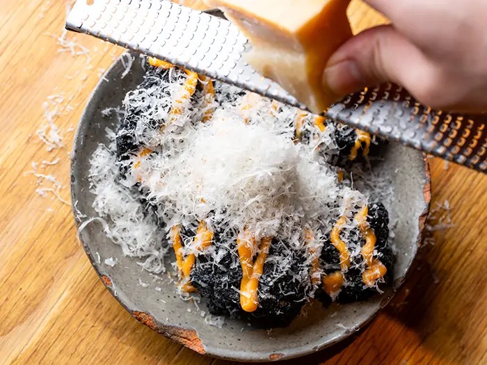 秘伝の出汁醤油にじっくり漬け込んだ鶏肉を、竹炭を練り込んだ特製粉でカラッと揚げ、漆黒の衣に仕上げました。そこへ濃厚でコク深いチェダーチーズソースを豪快にかけた、見た目も味もインパクト抜群の一品。