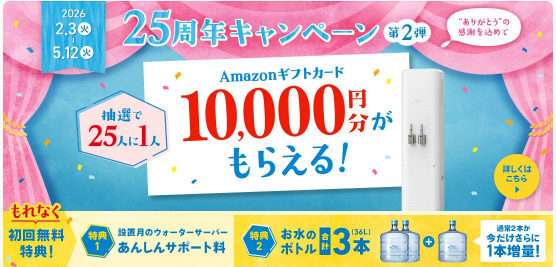 | おすすめポイント | 足元交換・Wクリーン機能 | 3種の天然水から選べる | デザイン性・軽量パック |